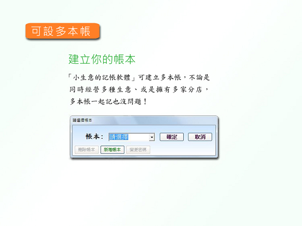 生意的核心就是金錢,做生意卻不清楚自己的帳,這就好像閉著眼睛在開車,以為會踩 油門就是會開車... 然而我們也知道創業者並不熟悉會計專有名詞,如果必須先把會計學好才能上路,等學通時,生意也已經不在那裏了.. 為此,我們以小雅的記帳軟體為基礎,開發出適合創業族使用的「小生意」記帳軟體。這套軟體除了與小雅 同樣具有有簡單、易懂、好操作的特點,在帳目